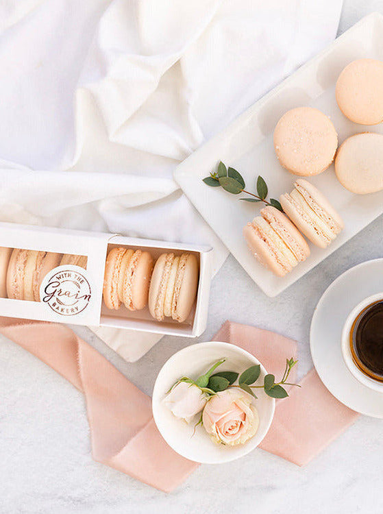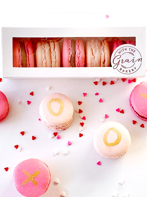 Package of 5 Macarons. Three strawberry & buttercream, 2 raspberry & rosewater white chocolate ganache